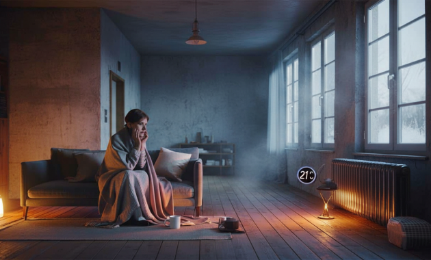 The radiator is making a clicking sound. The temperature is 21°C. You’re sitting on the couch with your shoulders hunched