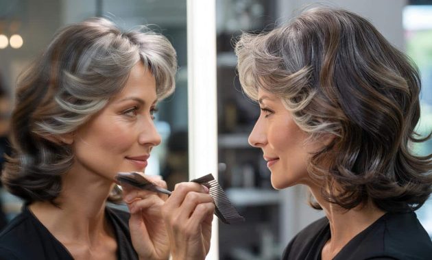 A woman in a navy blazer pulls a small brush out of her bag and starts brushing her roots in