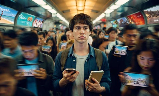 On a grey Tuesday morning in a crowded subway, everyone stared at their phones, thumbing through reels of beach sunsets,