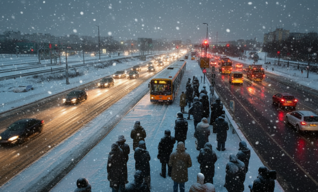The first flakes are still hidden, but the city already feels different. Late buses, tense faces at the station, and