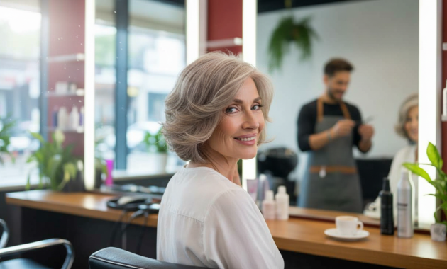 The woman in front of the mirror at the salon looks a little shocked. She looks to be in her