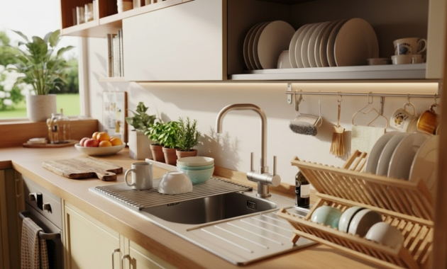 The plate falls off the top of the stack, slides down the side of the old plastic rack, and hits
